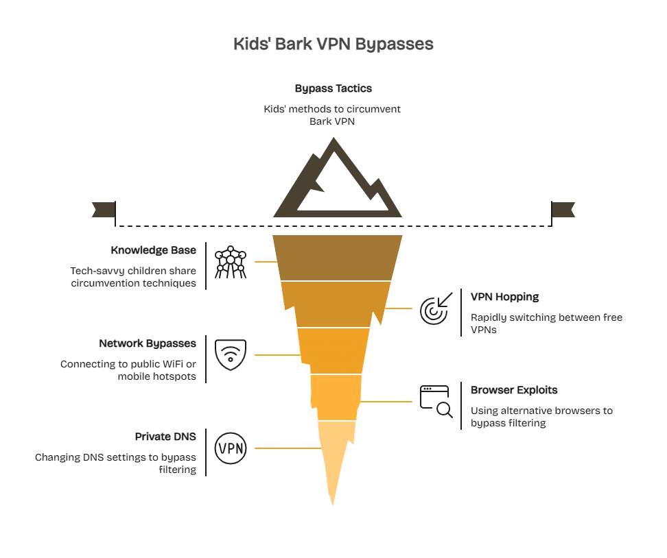 - Kids typically disable Bark VPN through device Settings > VPN toggle, install competing VPNs to override monitoring, or exploit battery optimization features that kill VPN connections.